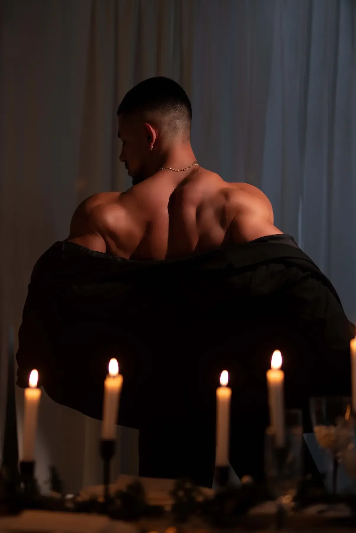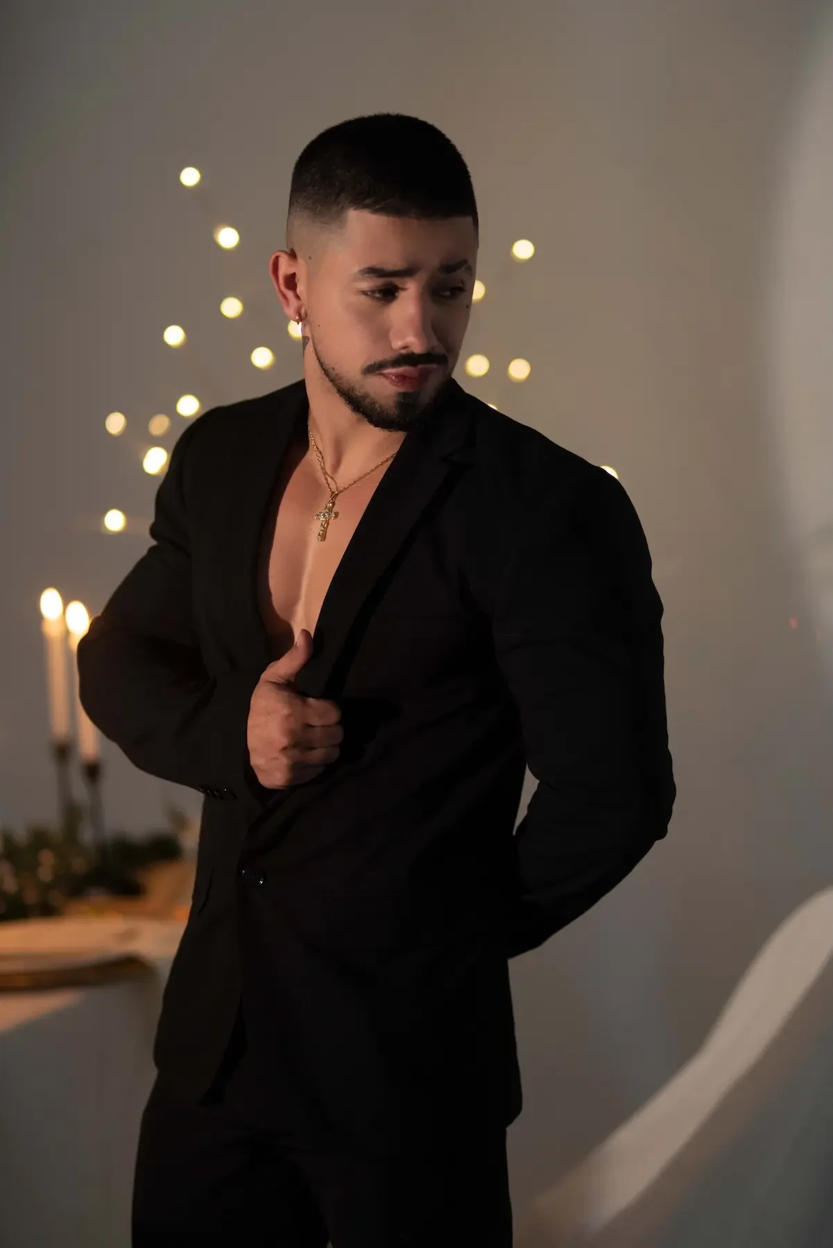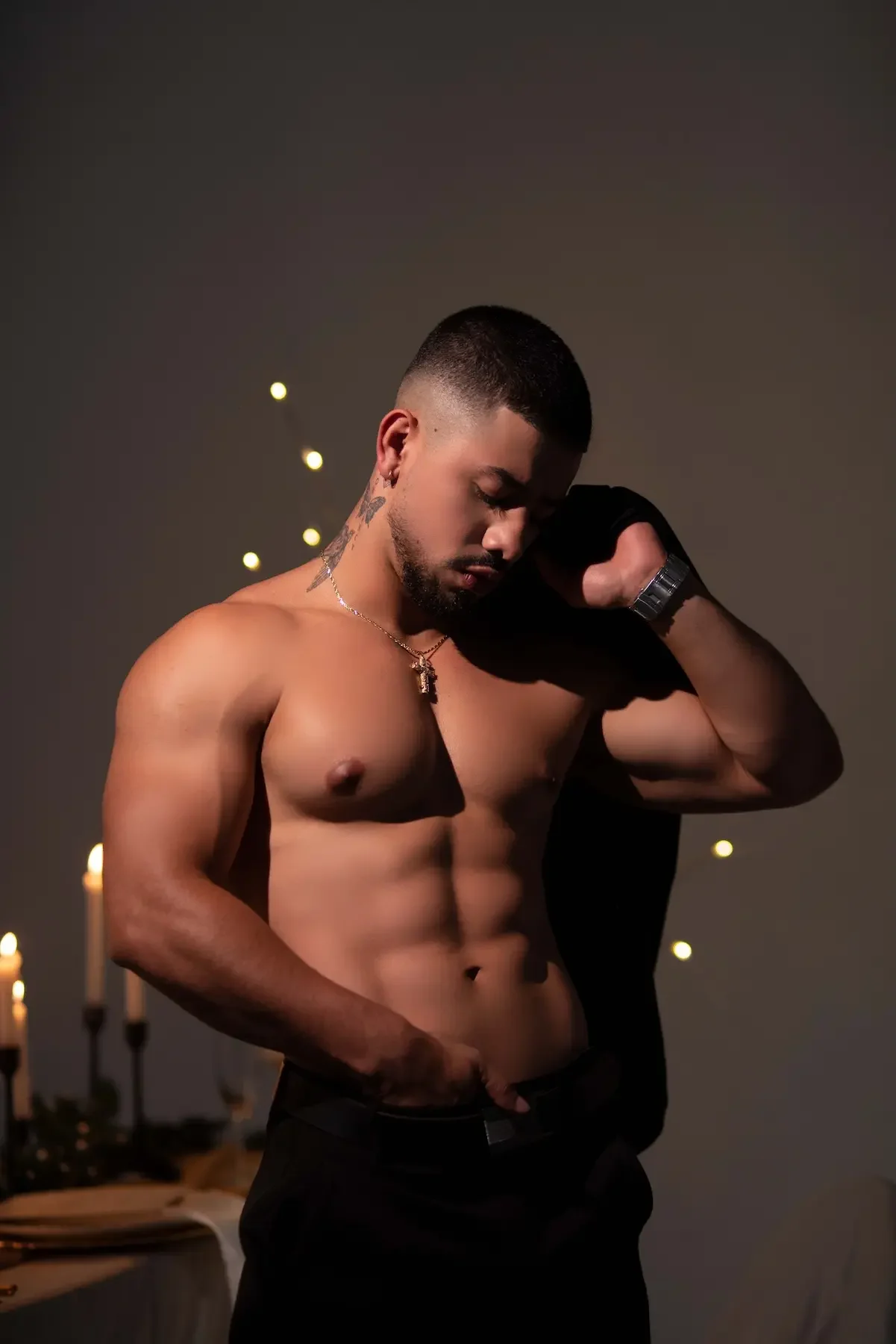 En su sesión de Invierno 2025, Ezzio Scolaro irradia fuerza y sensualidad contenida bajo la mirada precisa de Julio César, quien aprovecha las luces cálidas, las velas y el juego de sombras para resaltar cada línea de su físico. Entre arneses, camisas abiertas y un negro clásico que acentúa su porte, Ezzio se mueve con una mezcla de seguridad y contemplación, dejando ver un lado íntimo y sofisticado. La atmósfera invernal —minimalista, dorada y casi ceremonial— convierte cada retrato en una pieza que celebra su presencia, su disciplina y esa elegancia masculina que lo caracteriza.