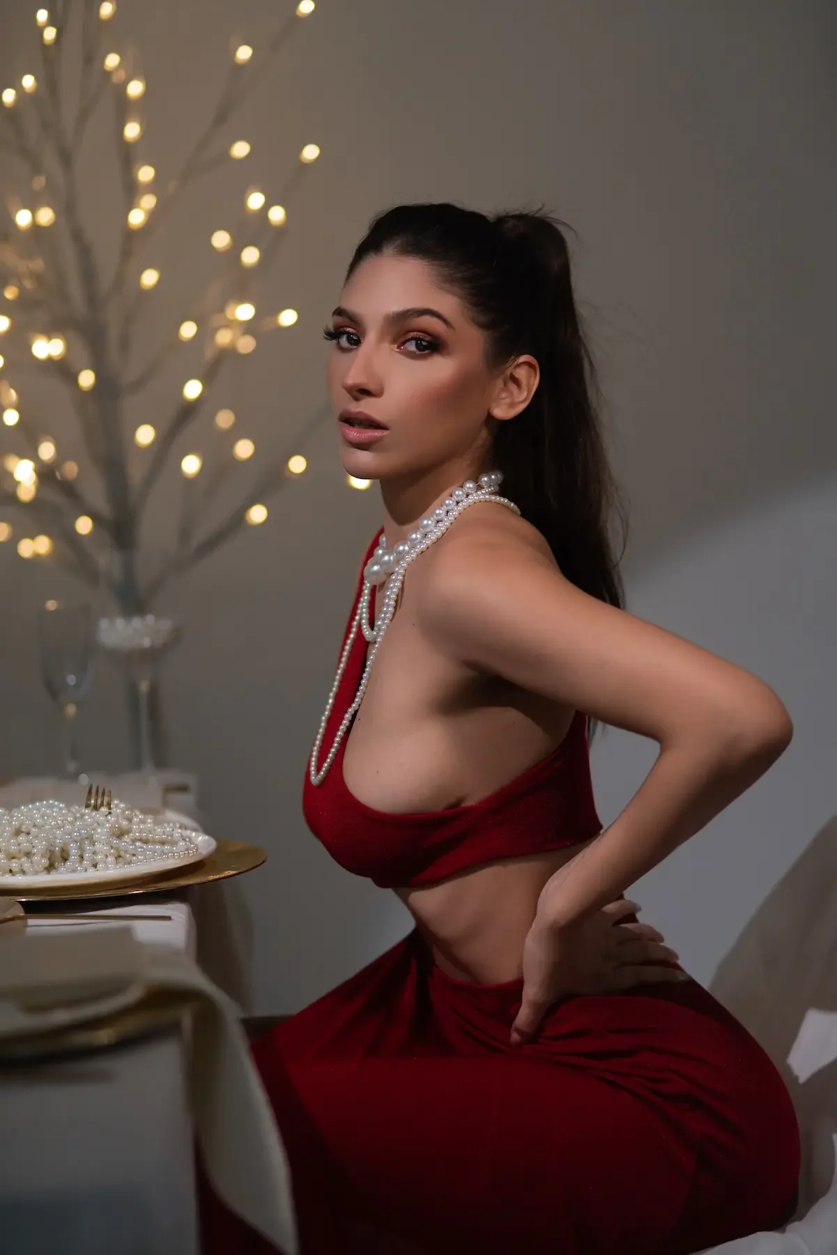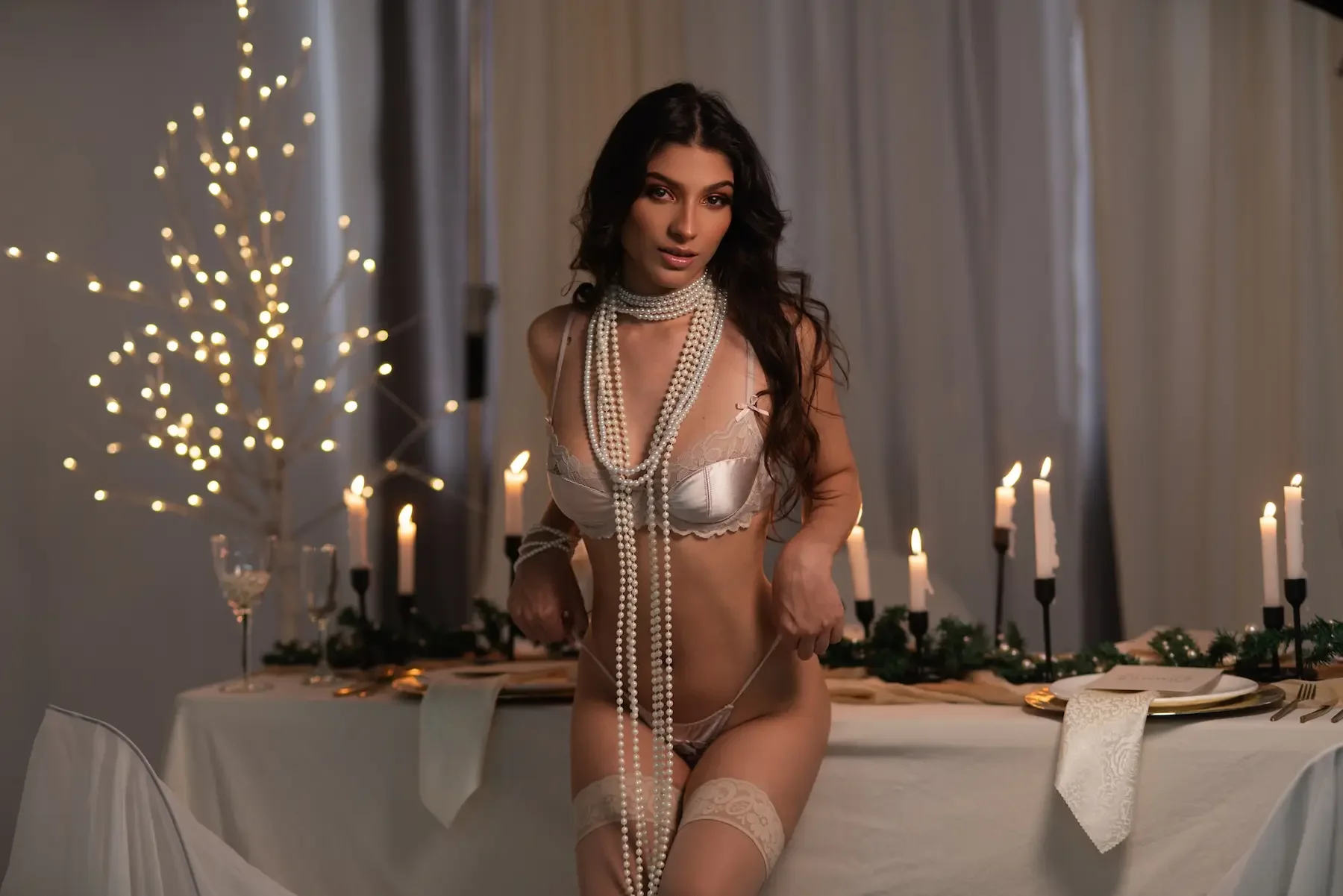 Rachel Duque encarna un glamour festivo y seductor en esta sesión, donde Julio César mezcla luces cálidas, velas y destellos dorados para crear un ambiente íntimo y sofisticado. Entre perlas, lencería y un vestido rojo que acentúa su elegancia, Rachel proyecta una sensualidad segura, jugando con miradas directas y poses que celebran su presencia con estilo cinematográfico. Esta editorial la muestra como una mujer que domina la escena con carisma y delicadeza, convertida en el centro absoluto de un escenario creado para brillar.